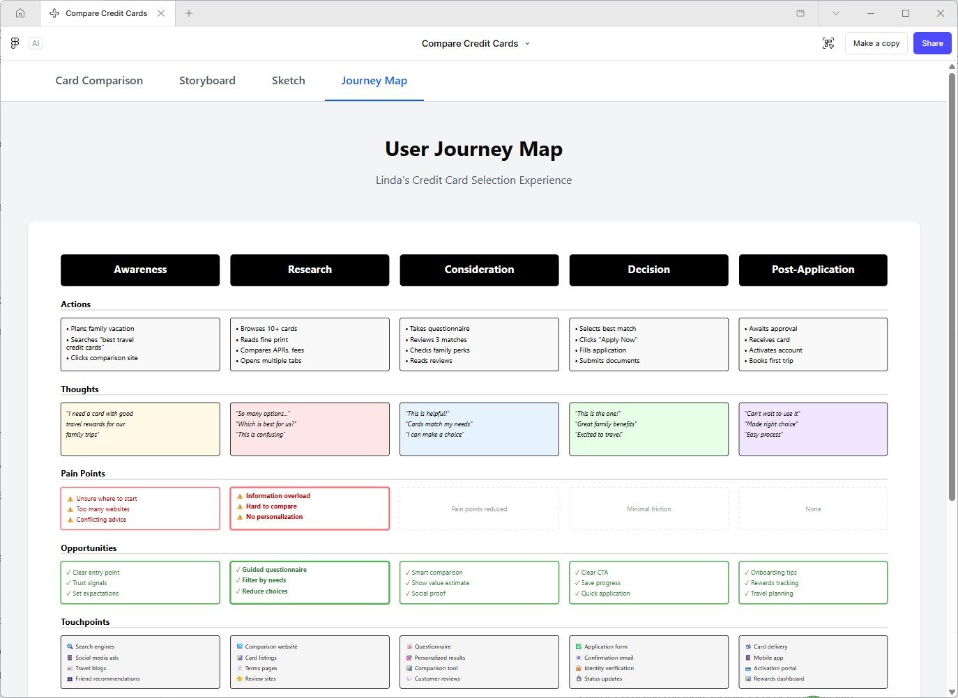 Description: Linda sees 2–3 recommended cards tailored to her profile. Each card highlights: Estimated yearly rewards value Family-friendly perks Key differentiators “Why this is a match for you” Comparison is simplified to the most relevant variables.
