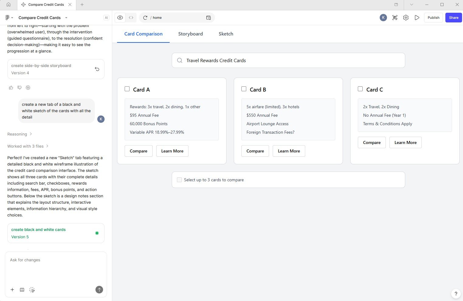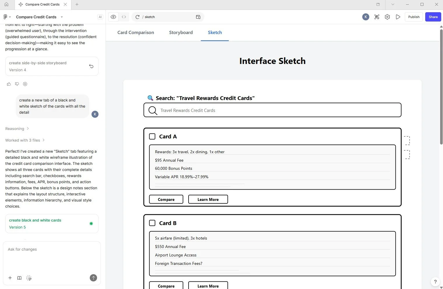 Created a new "Sketch" tab featuring a detailed black and white wireframe illustration of the credit card comparison interface. The sketch shows all three cards with their complete details including search bar, checkboxes, rewards information, fees, APR, bonus points, and action buttons. Below the sketch is a design notes section that explains the layout structure, interactive elements, information hierarchy, and visual style choices.