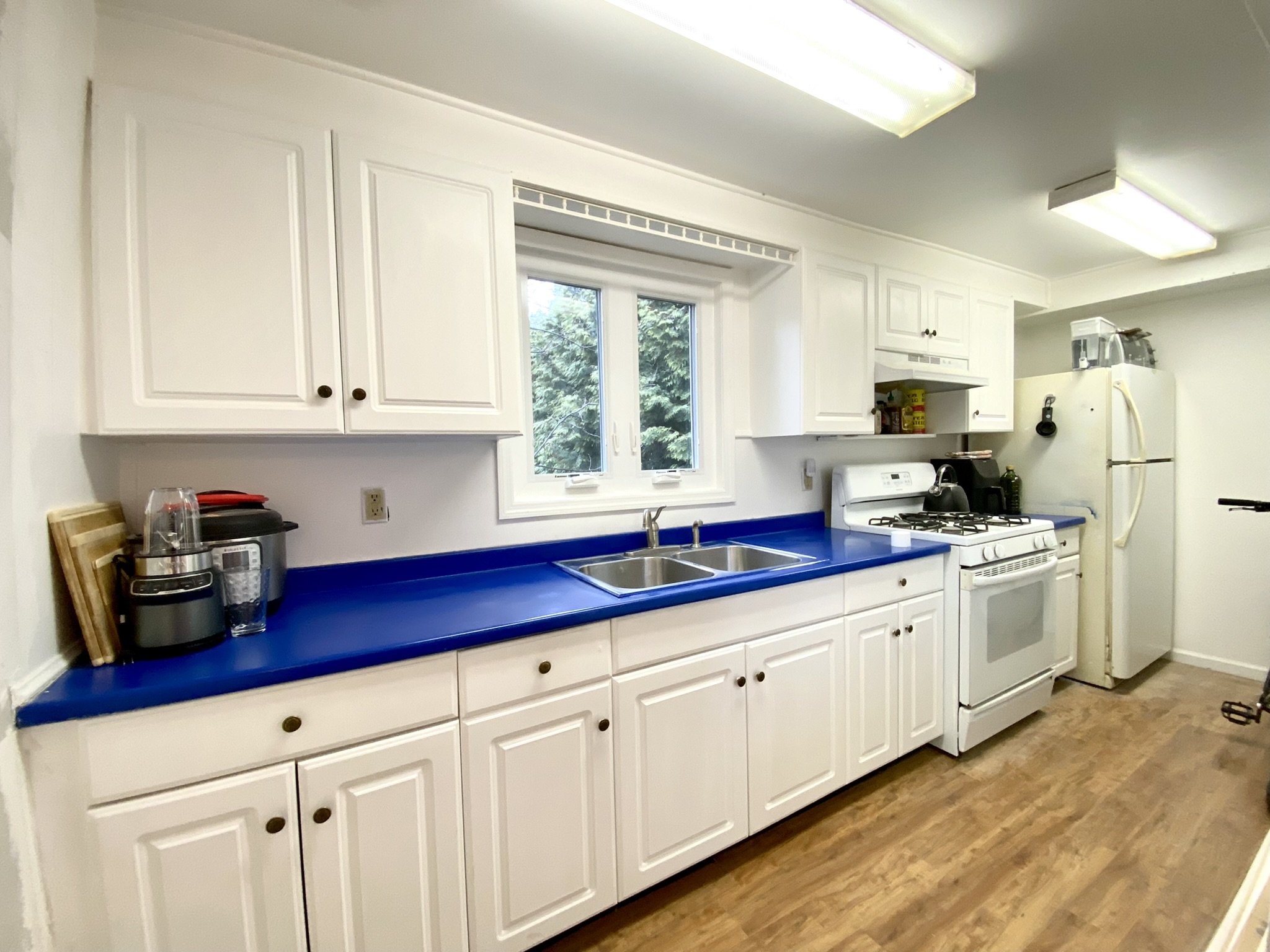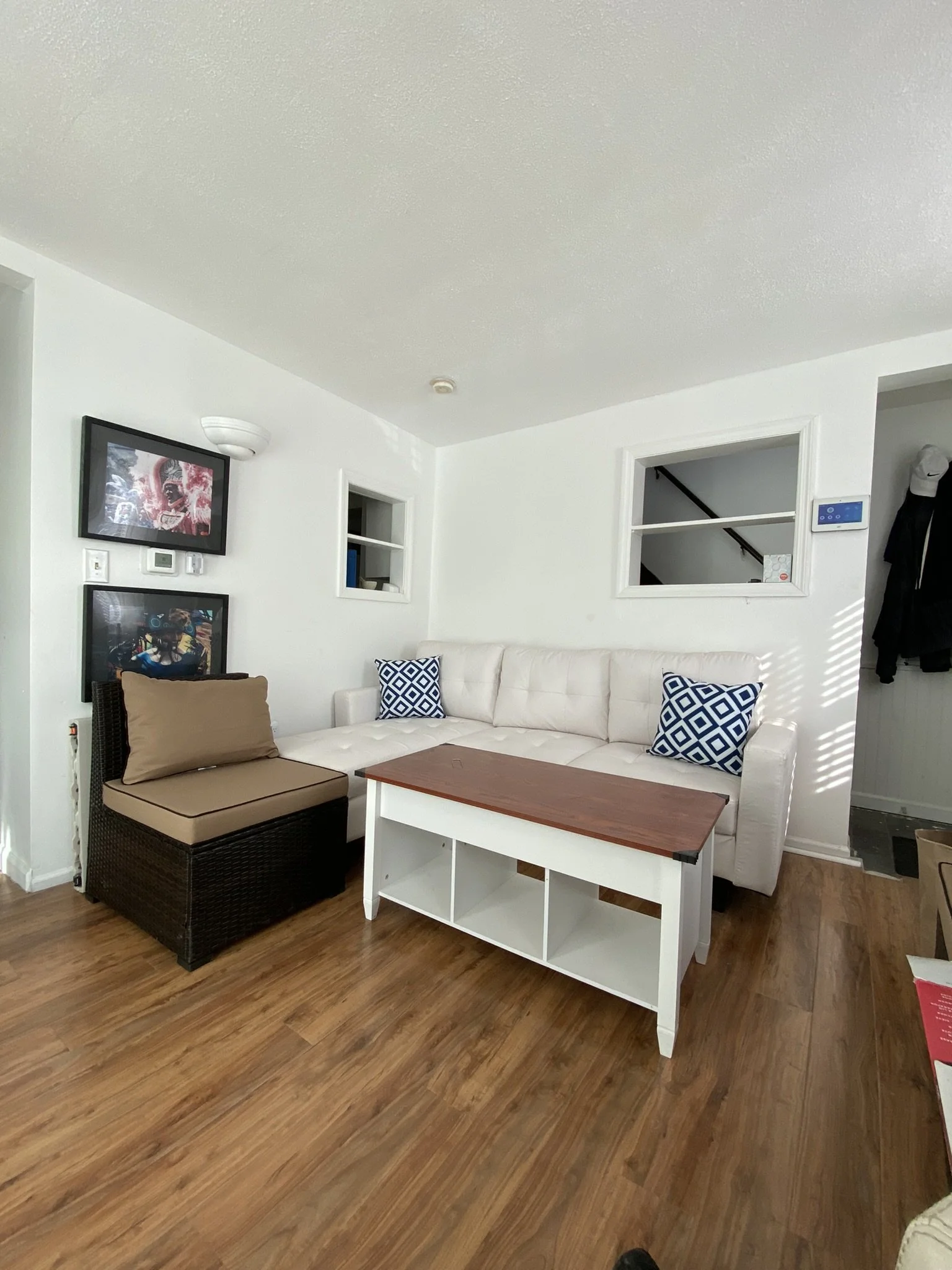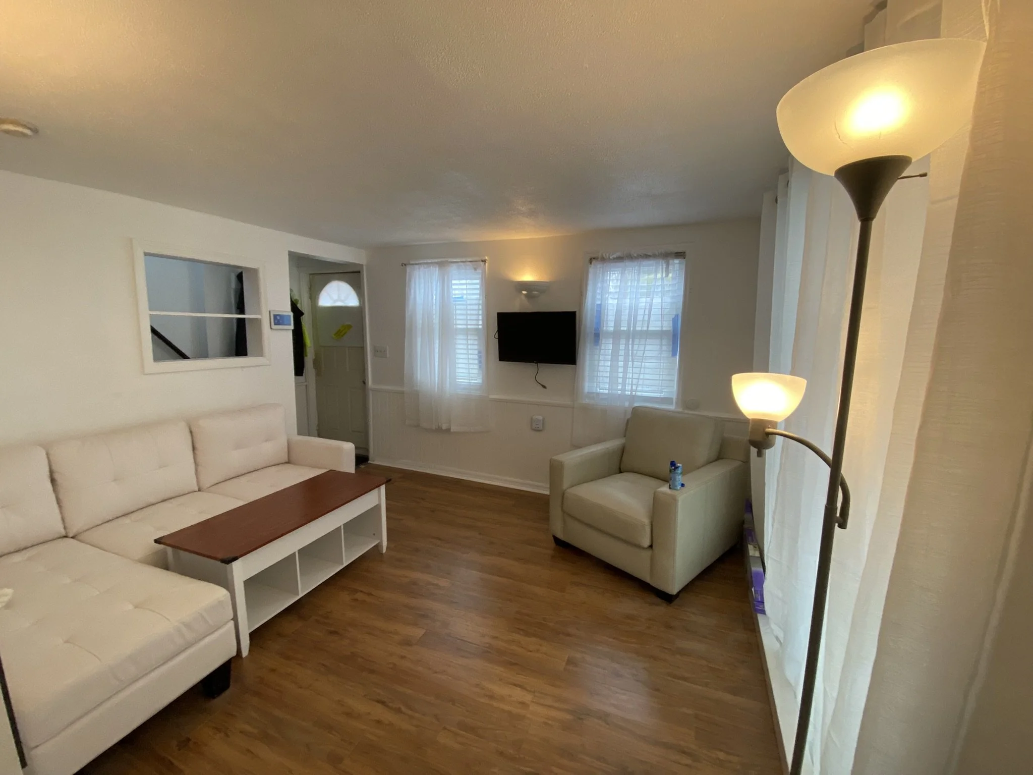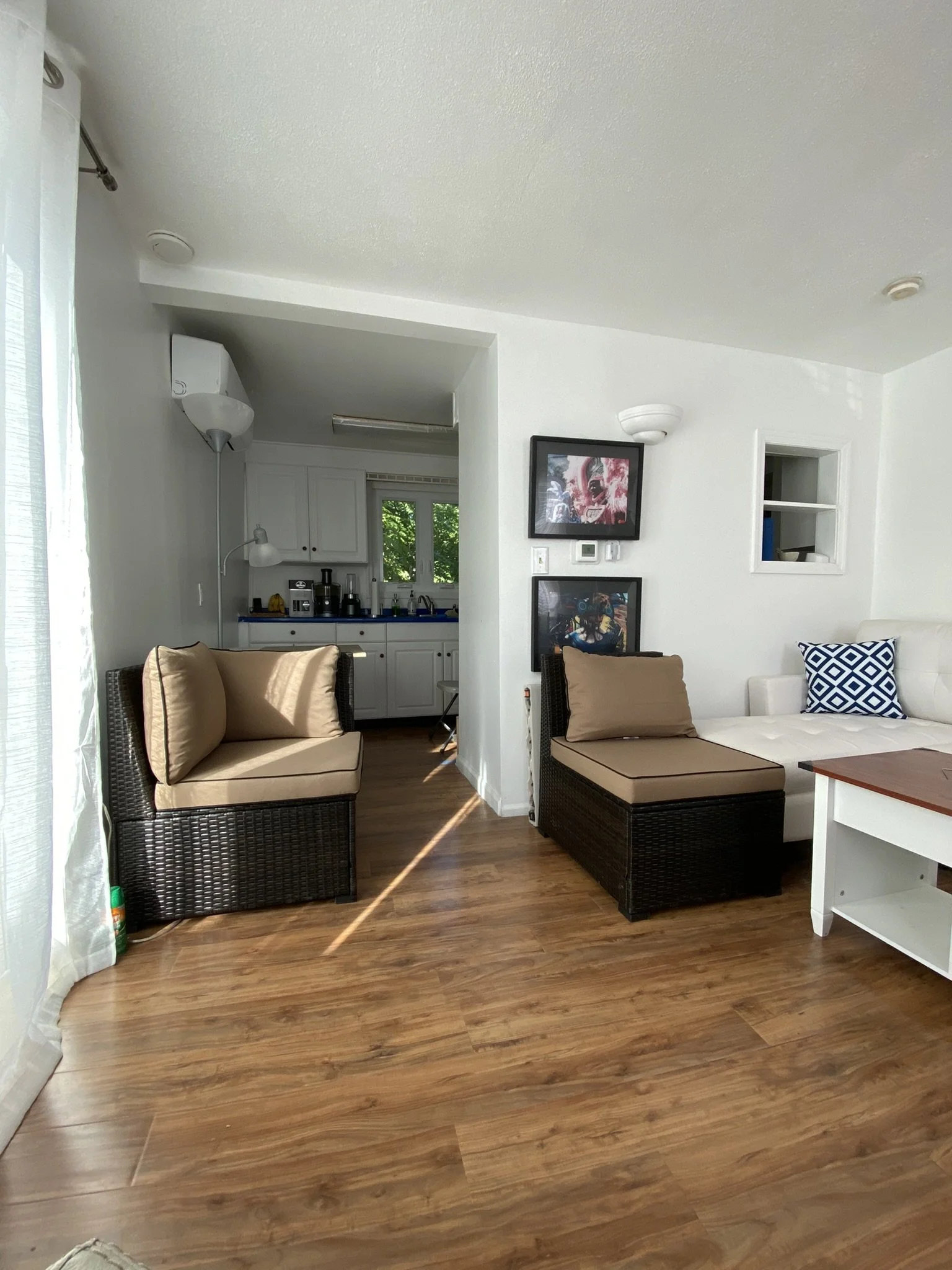 Laminate flooring throughout the living room and kitchen